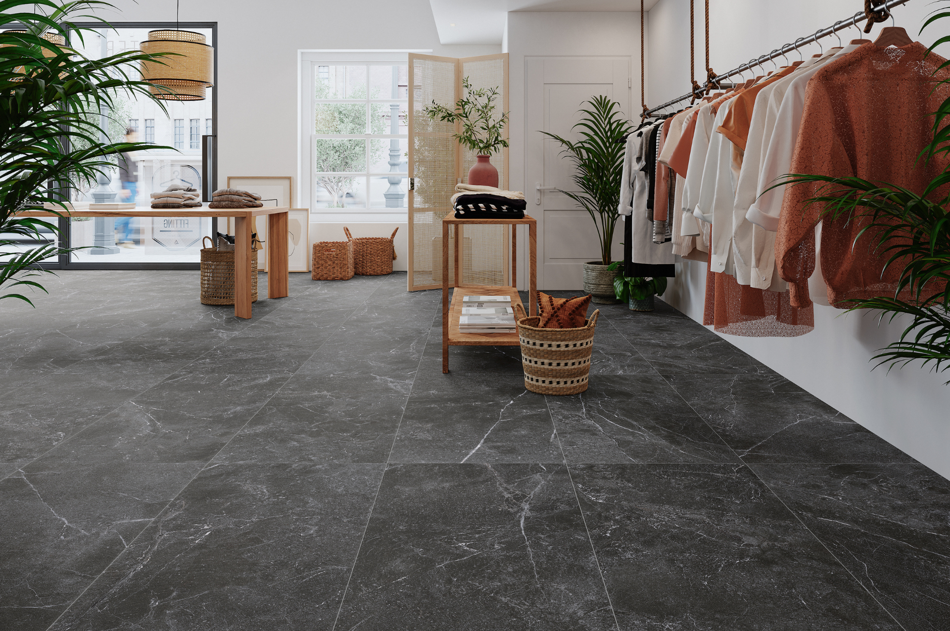 Blade Grafito de Alaplana, con su acabado piedra oscura y sofisticada, es ideal para crear espacios contemporáneos con carácter. Encuéntrala en Elola Dos, en Madrid.